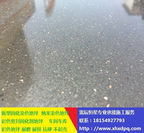 4、染色:根據需要在研磨拋光的中后期,磨片研磨至300號左右后,晾干地面用輥筒進行染色操作。染色先用滾筒整體滾涂一遍,一小時后,用滾筒沿垂直方向再均勻滾涂一遍。如要求較深的染色深度,可增加染色劑在地面的濕潤時間。二天,用較細的1000號樹脂磨片整體拋光一遍。此時染色地面已達較好表面效果。根據需要可用上光液、保護劑再進行整體拋光一遍,表觀效果更佳。