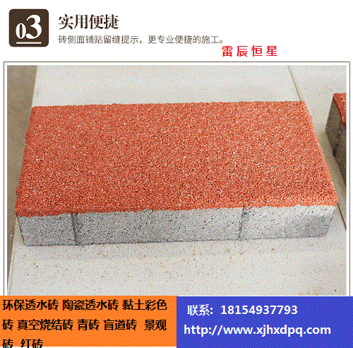 1: 透水性好:陶瓷透水磚采用合理的顆粒級配,可以迅速透過小到中雨的降水量。 2 :高強度:產品是經過1200-1300℃高溫燒成,產品結合是由顆粒間物理成分熔融后冷卻形成的結合,強度非常高。通常大于45兆帕。 3:抗凍融性能好:由于顆粒間孔隙大,結合是燒結結合,對于北方的凍融有良好的抗性。很好的解決了水泥透水磚的透水好則抗凍融不過關,抗凍融好則不透水的難題。 4:防滑性能好:陶瓷透水磚表面顆粒較粗,雨水滲透快,雨后和雪后不積水、不形成冰層,防滑效果較好。 5:良好的生態環保性能:可采用陶瓷廢料、下水道污泥顆粒、廢耐材、過火矸等工業廢料生產,而且可重復利用。破碎后可再次燒制成磚。 6:可改善城市微氣候、阻滯城市洪水的形成:陶瓷透水磚的孔隙率在20-30%,本身有良好的蓄水能力,在夏天,雨后水吸滿滲透入地,滋養地氣、涵養水源、對樹木和花草提供水分;在陽光強烈時,水分蒸發可降低地表溫度,改善微氣候。如形成大面積鋪裝,可有效阻滯雨水,減少城市洪水形成的幾率。